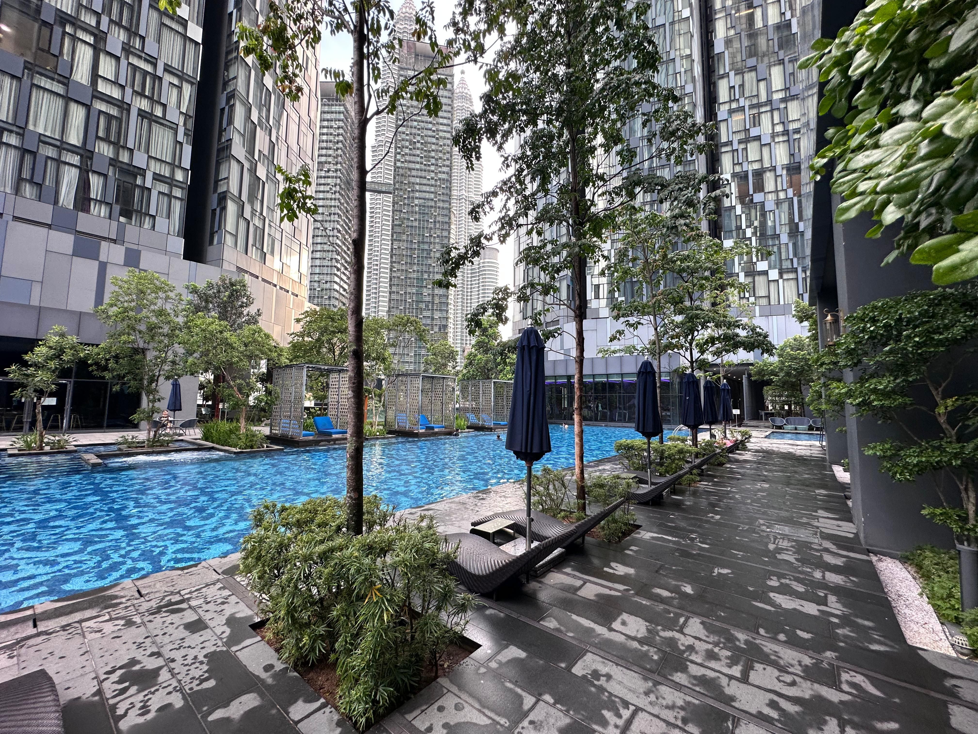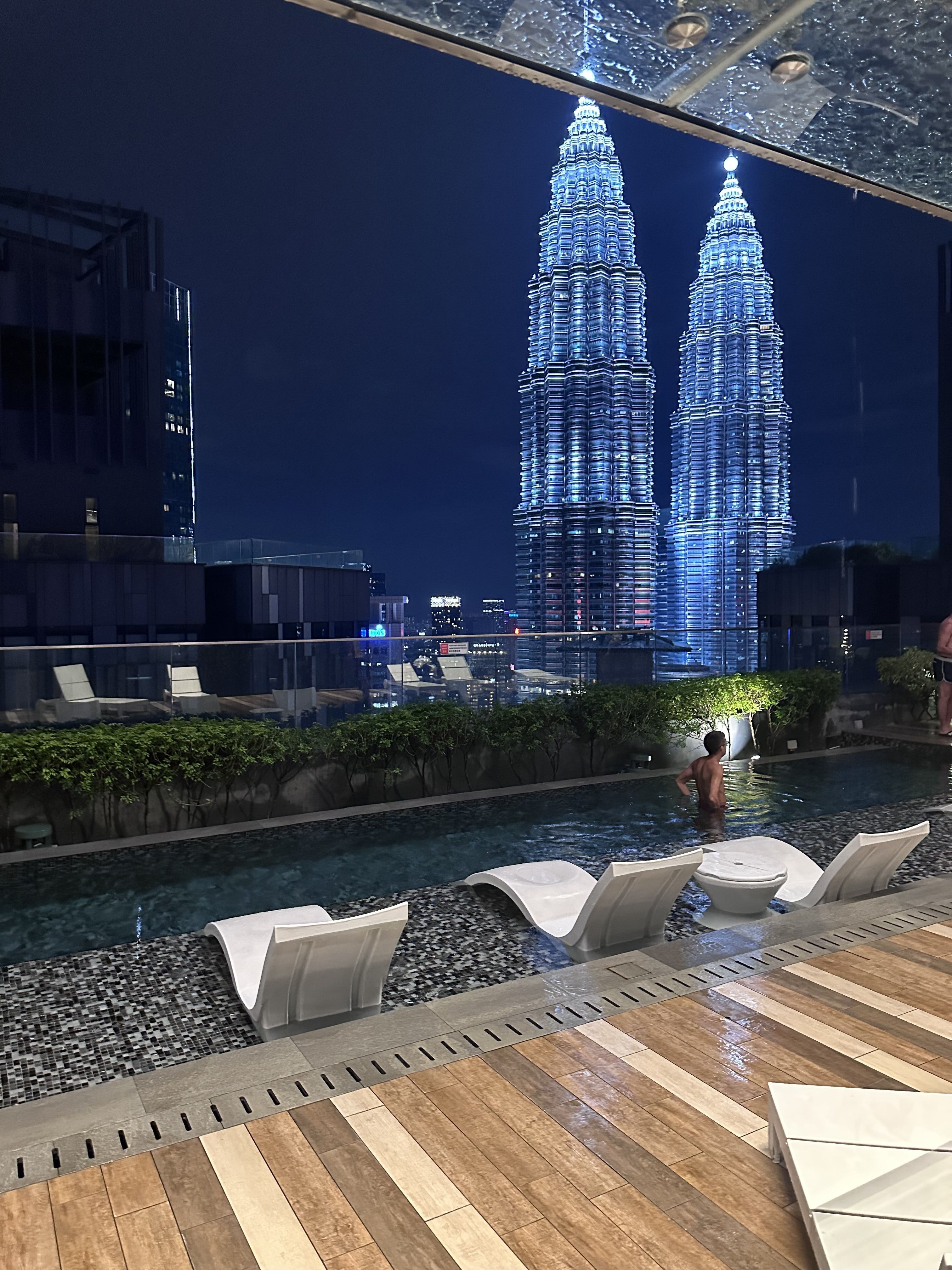 До башен Петронас — всего 5-10 минут пешком. В моём комплексе бассейн находится на 69 этаже, и вечером вид на башни просто фантастический. Выходишь вечером к бассейну, и вот они — прямо перед тобой.