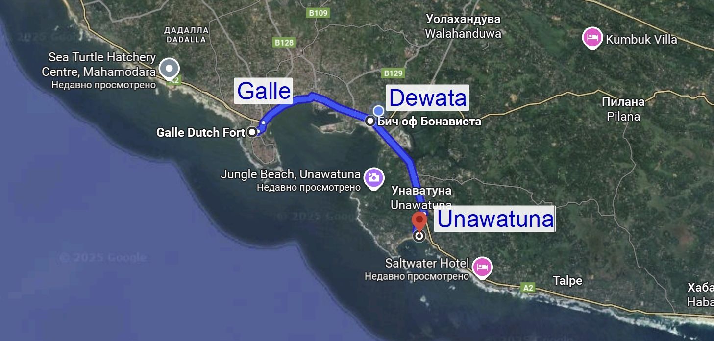 Я жил в Девата около двух недель и почти каждый день ходил в Унаватуну — в рестораны, на пляж, иногда в Галле. Также поступают и многочисленные туристы, живущие в ее окрестностях.
