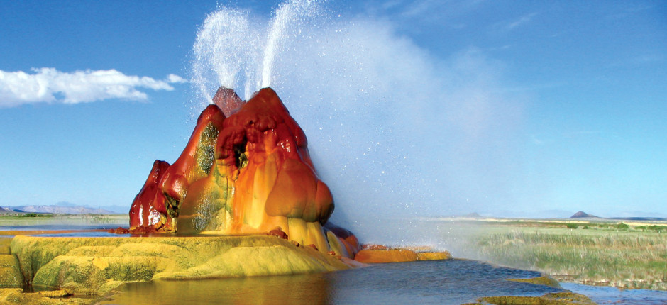 Fly Geyser в Неваде — это необычное сотрудничество между человеком и природой. Многоцветный геотермальный гейзер регулярно распыляет воду на полтора метра в воздух. Искусственный гейзер на краю пустыни Блэк Рок в Неваде с годами увеличился в размерах и продолжает расти по сей день. Увеличение в размере происходит в результате того, что различные минералы выбрасываются и накапливаются на поверхности.
