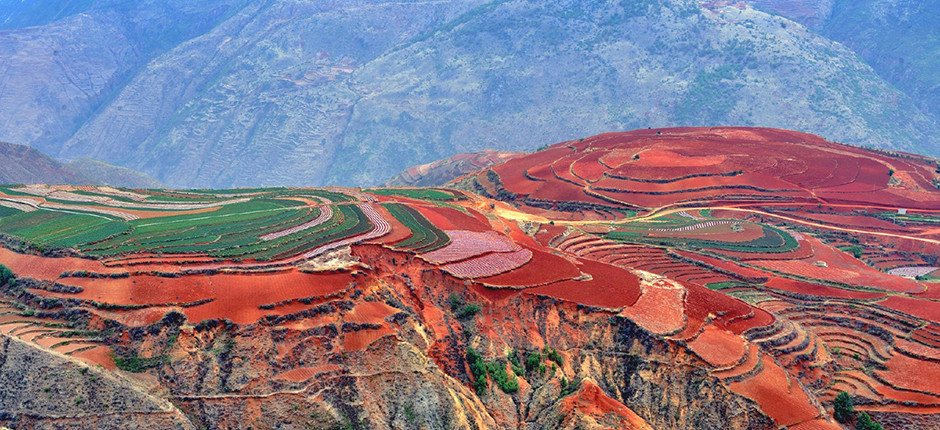 На высокогорном плато Юньнань расстелилась красочная земля, раскрашенная во все цвета радуги. Земли Дончуань — сельское место в горной области Вуменг, в 180 км к северу от Куньмина, стало очень известным среди китайских фотографов благодаря своей красной почве.