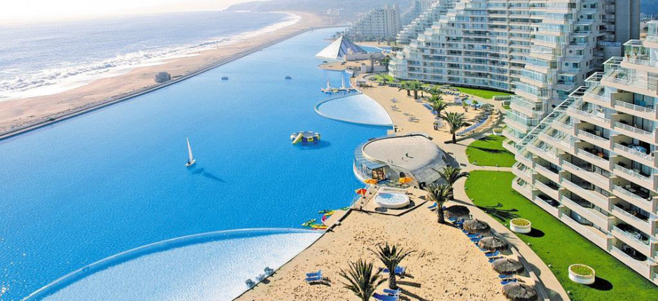 Если вы будете в Чили, обязательно посетите это уникальное сооружение. Оно было построено в 2006 г. инженером Фернандом Фишманном. Идея обустроить огромный бассейн на самом берегу океана – на первый взгляд может показаться странной, но резоны для этого были. Во-первых, побережье возле Сан-Альфонсо-дель-Мар буквально кишит акулами, а во-вторых, вода на широте Сантьяго довольно холодная. По этим причинам, местные пляжи не пользовались у туристов большой популярностью. С постройкой чудо-бассейна все изменилось. Температура воды в нем поддерживается на уровне +26 °С, а морская вода перед закачкой в искусственный водоем фильтруется, а возможно и насыщается озоном. Иначе, чем объяснить ее небесно-голубой цвет?